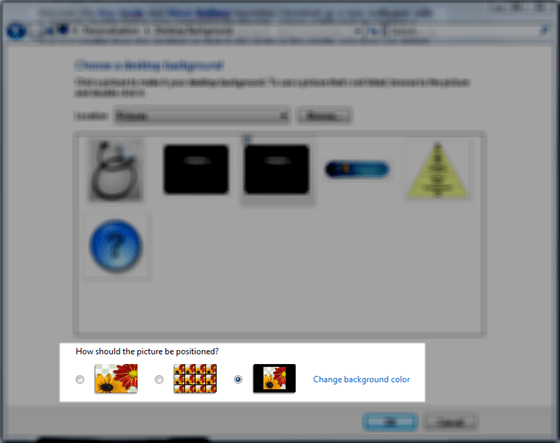 As I said before the trick making this work is to blend in with the background. The desktop background, that is. So first I set the image as the wallpaper ensuring that it is set to center the image, then I click on the Change background color link and set that to black.