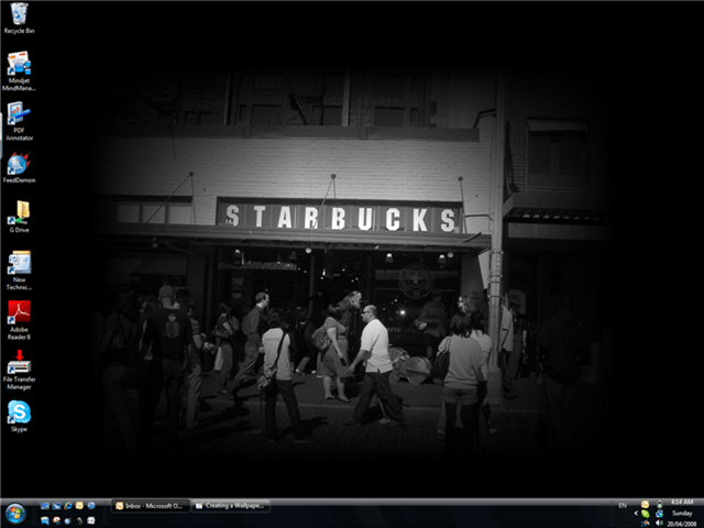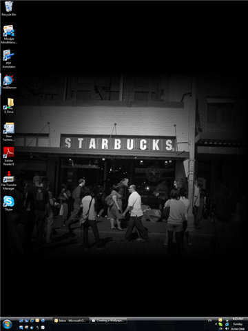 Between the Ray Ozzie and Steve Ballmer keynotes I knocked up a new wallpaper with a distinctly Seattle feel to it to commemorate the trip. I have a little trick for making a wallpaper that works in both portrait and landscape. This is basically to size the image so that it is smaller than the desktop so that it sits nicely in the middle and does not distort when you rotate into portrait mode. To make this work you need to ensure that width of the image is less than or equal to the short side of the screen. For instance on my Lenovo X60 I run at 1440×1050 – so the target size will be such that the top edge of the photo above would be 1050 pixels wide.